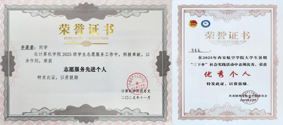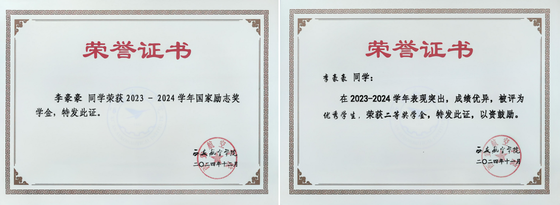 在学习方面,李豪豪同学始终保持严谨治学的态度,课上认真听讲,课后及时复习巩固,建立了完整的知识体系。通过科学的学习方法和不懈的努力,其专业成绩长期保持优异水平,连续获得国家励志奖学金及校级一、二等奖学金,展现了良好的专业素养和学习能力。