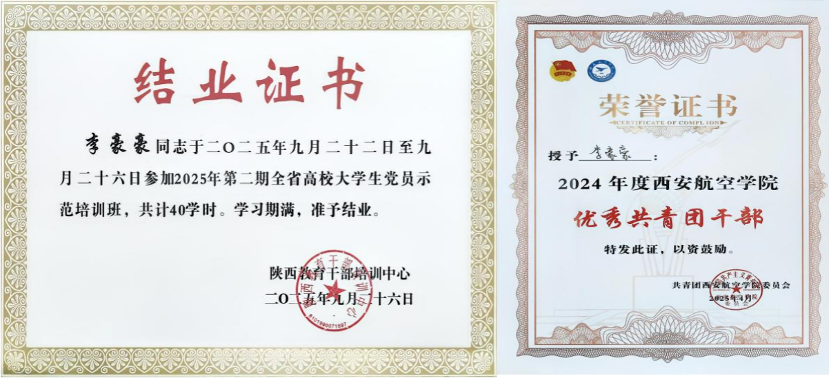 作为中共预备党员,李豪豪同学始终把政治理论学习摆在首要位置,以高度的政治自觉践行党员标准。经组织推荐,该同学入选2025年全省老员工党员示范培训班(由中共陕西省委教育工委、陕西教育干部培训中心联合举办),通过系统性理论学习和实践锻炼,进一步提升了政治素养,增强了党性修养。日常工作中,该同学充分发挥党员先锋模范作用,积极参与集体事务,被评为“优秀共青团干部”。